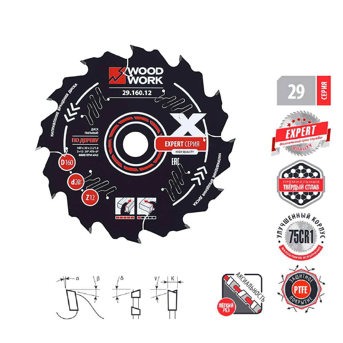 - Диск пильный Эксперт 160 x 2,2/1,6 x 20 Z=12 A=20 универсальный 29.160.12