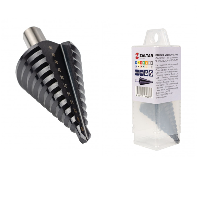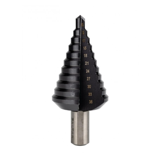 Ступенчатое сверло из высококачественной быстрорежущей стали HSS. Режущие кромки отшлифованы кубическим нитридом бора CBN. Стружечная канавка прямой формы. Оптимизированная геометрия режущей кромки. 3-х плоскостной хвостовик для улучшенной передачи крутящего момента.