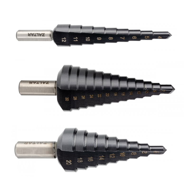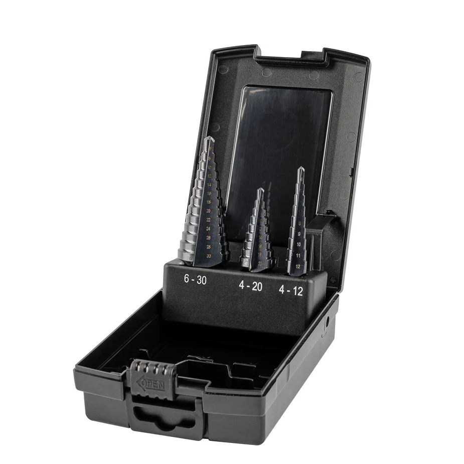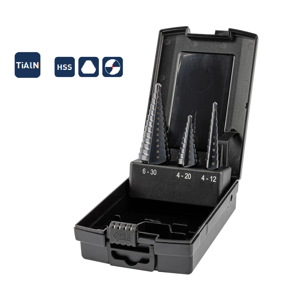 Набор сверл ступенчатых из высококачественной быстрорежущей стали HSS. TiAlN. Режущие кромки отшлифованы кубическим нитридом бора CBN. Стружечная канавка прямой формы. Оптимизированная геометрия режущей кромки. Трехплоскостной хвостовик для улучшенной передачи крутящего момента.